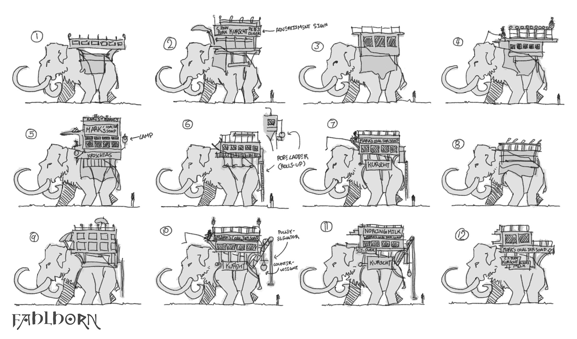 Explorations for a mammoth-supported mode of transportation for my Fahlhorn project. Inspired by elephant rides and older tour-buses and cars.