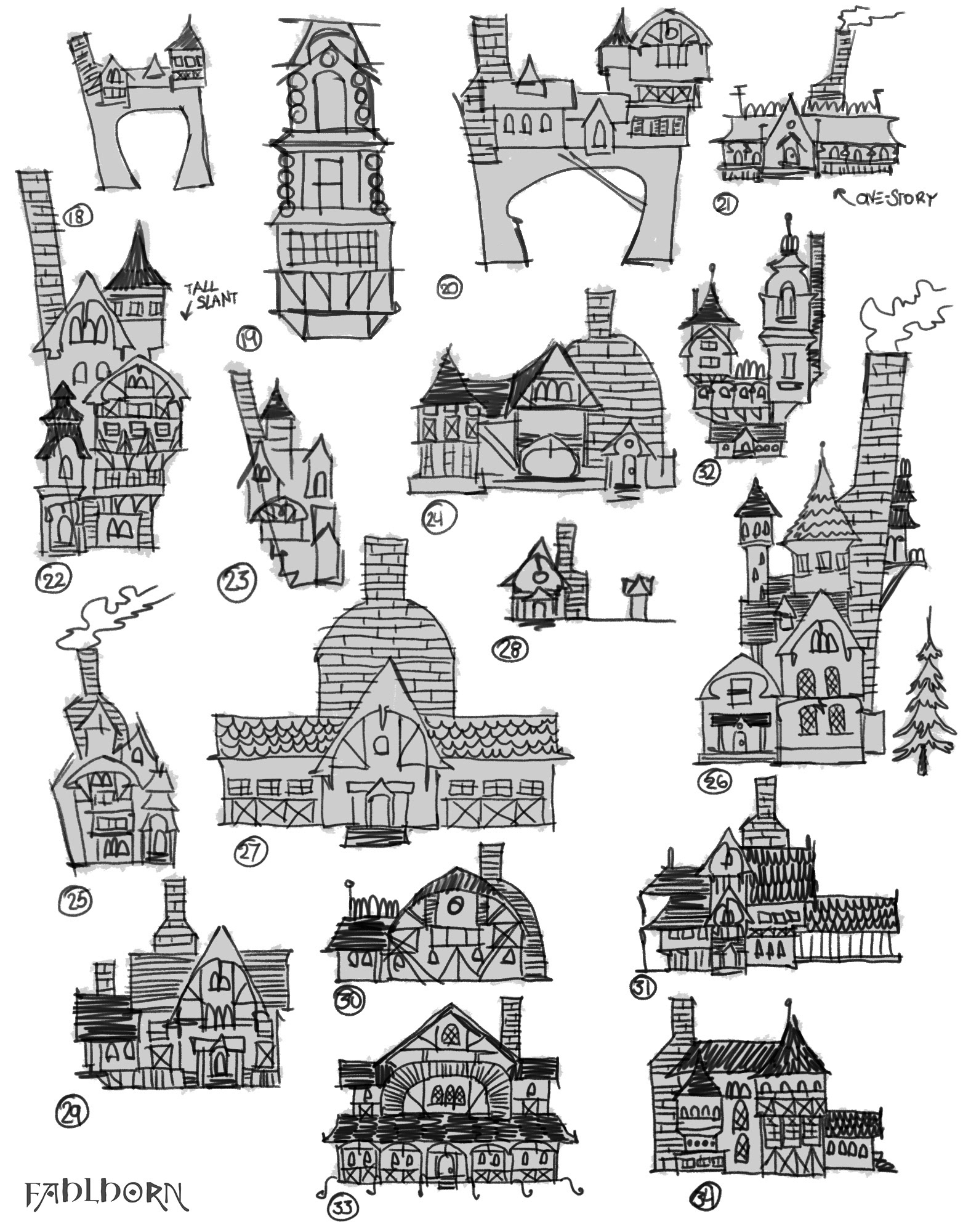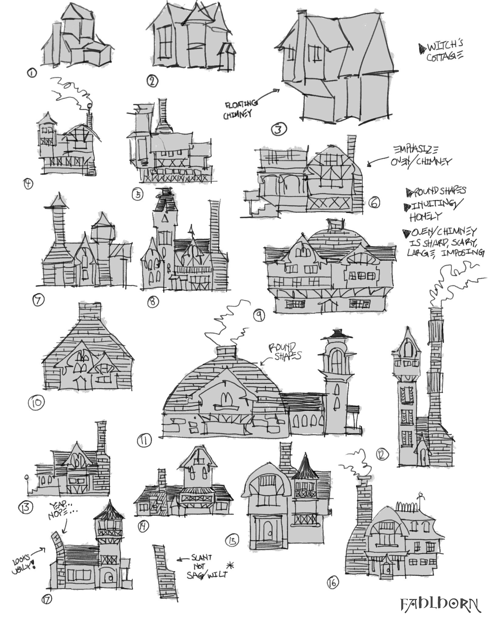 Explorations for witch-cabin designs for my Fahlhorn project. Inspired primarily by Germanic architecture and log cabins.