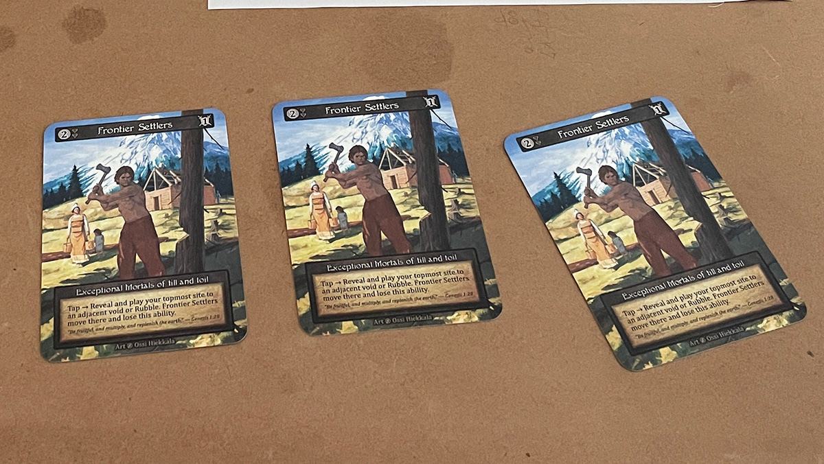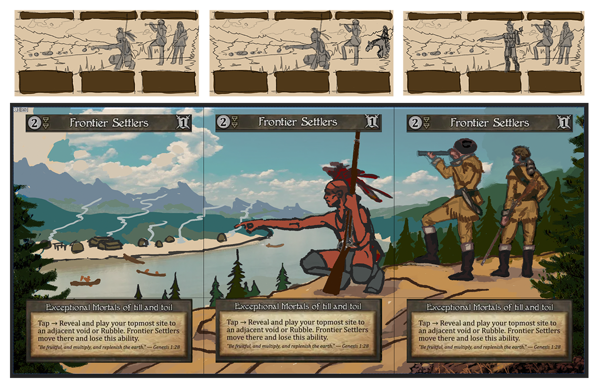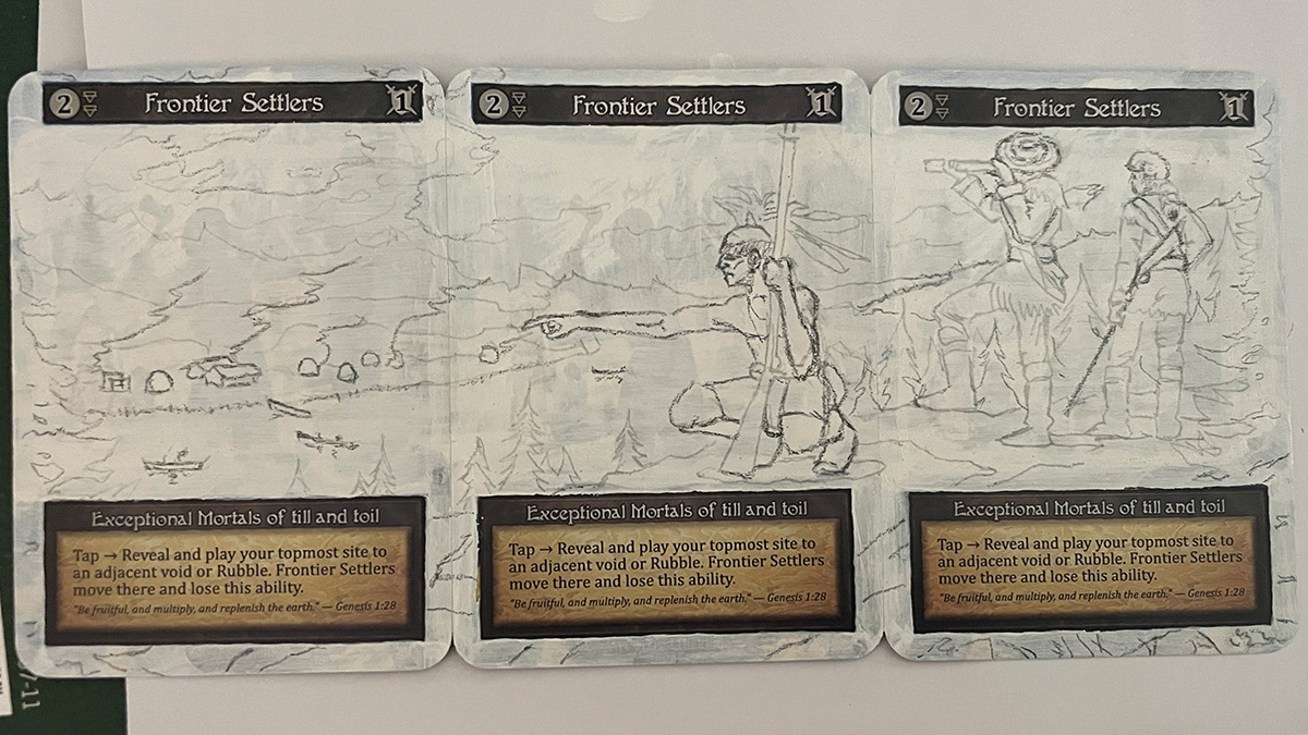 An altered-art set of trading cards from the game Sorcery: Contested Realm. Design was focused around "exploring" and "Kentucky" so went for a "Lewis and Clark" exploration of 1800s Kentucky with the Ohio River featured, a Native American friend, and a distant Shawnee village.