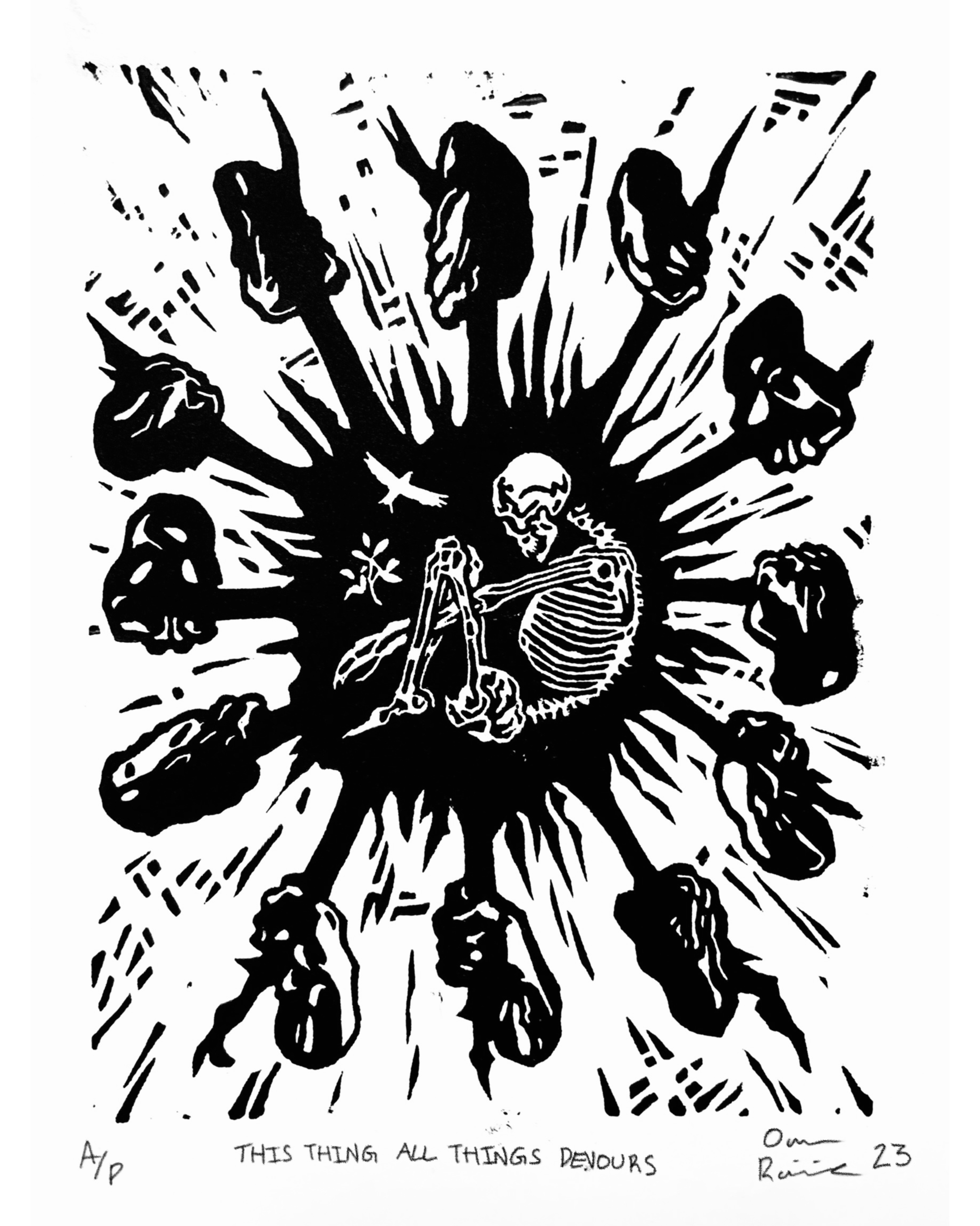 Represents time. Inspired by Gollum’s riddle from J. R. R. Tolkien’s The Hobbit. Twelve circling hands represent the numbers on a clock, with each hand ripping at a skeleton, a plant, and a bird. In quote with the verse from Gollum’s riddle: “This thing all things devours: Birds, beasts, trees, flowers.”