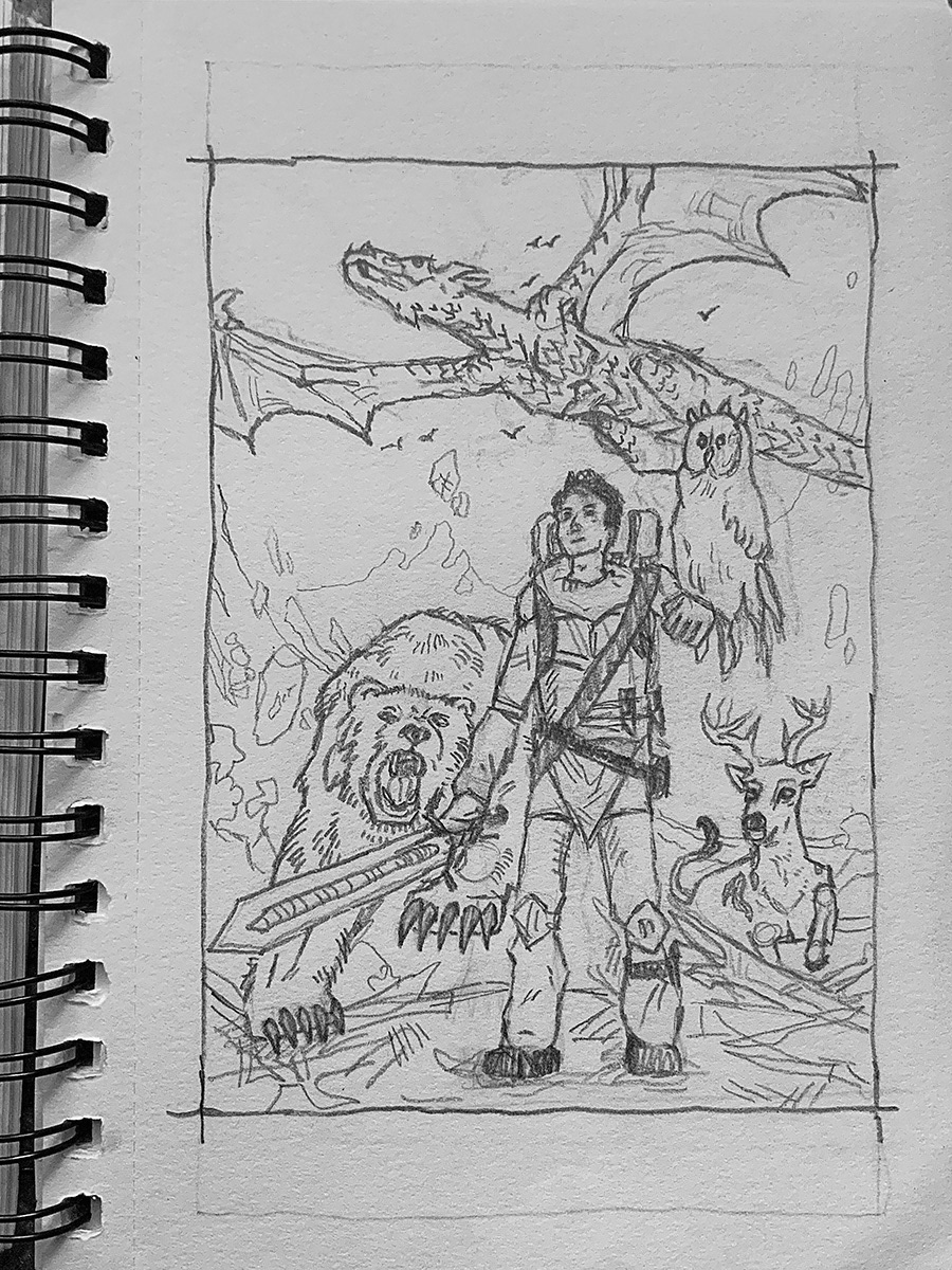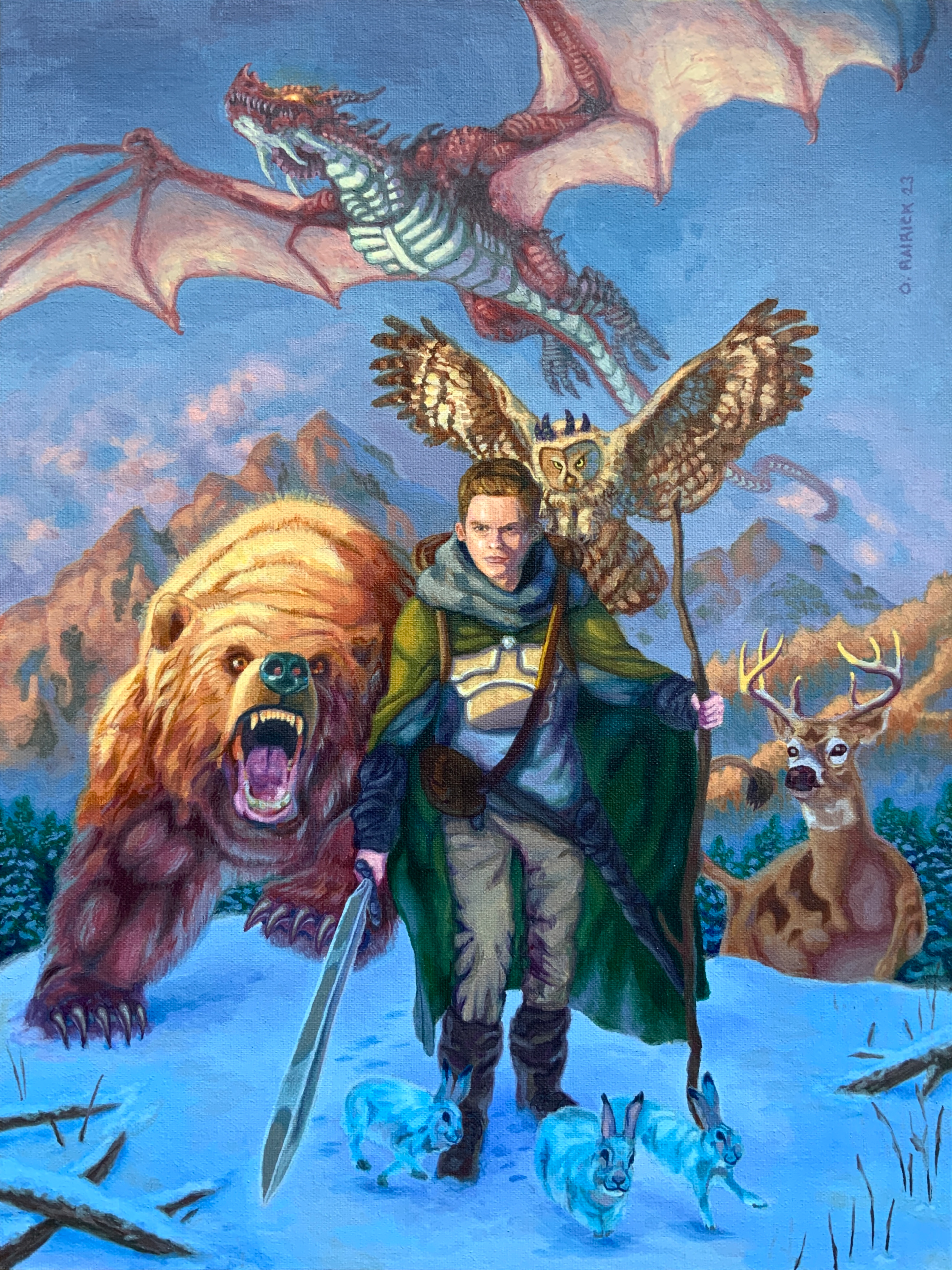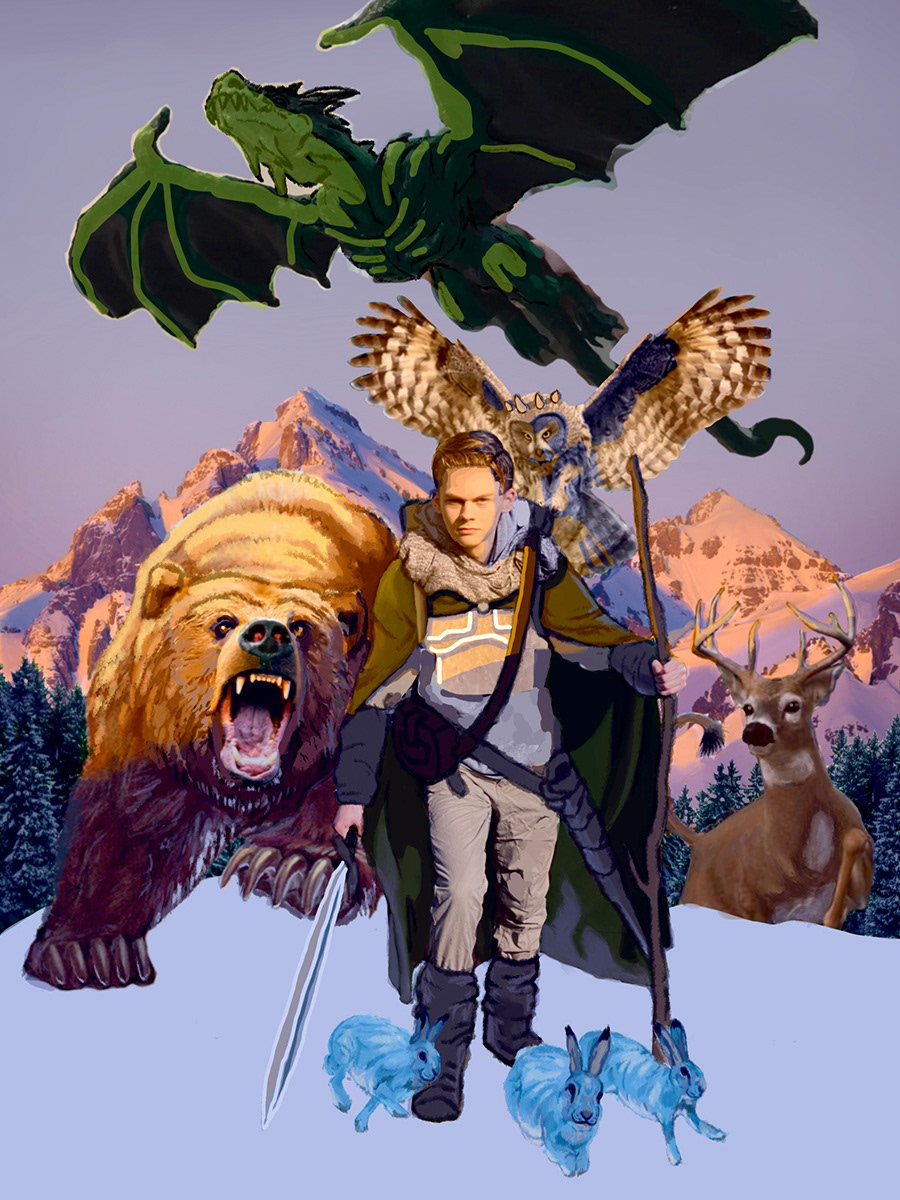 Self portrait of myself as an adventurer, warrior, and befriender of beasts. Focus on perspective, atmosphere, and the golden hour lighting to add interest and depth. Created my own maquette of a dragon and dressed up for reference.