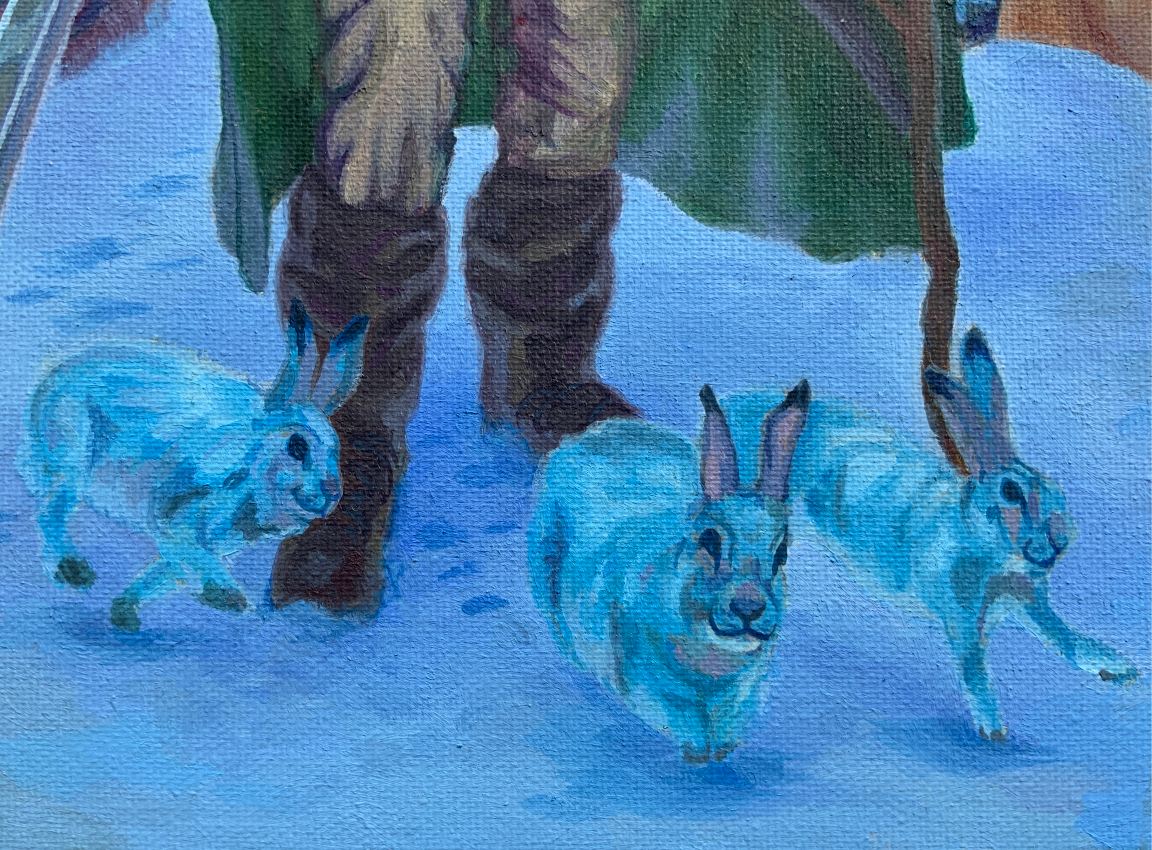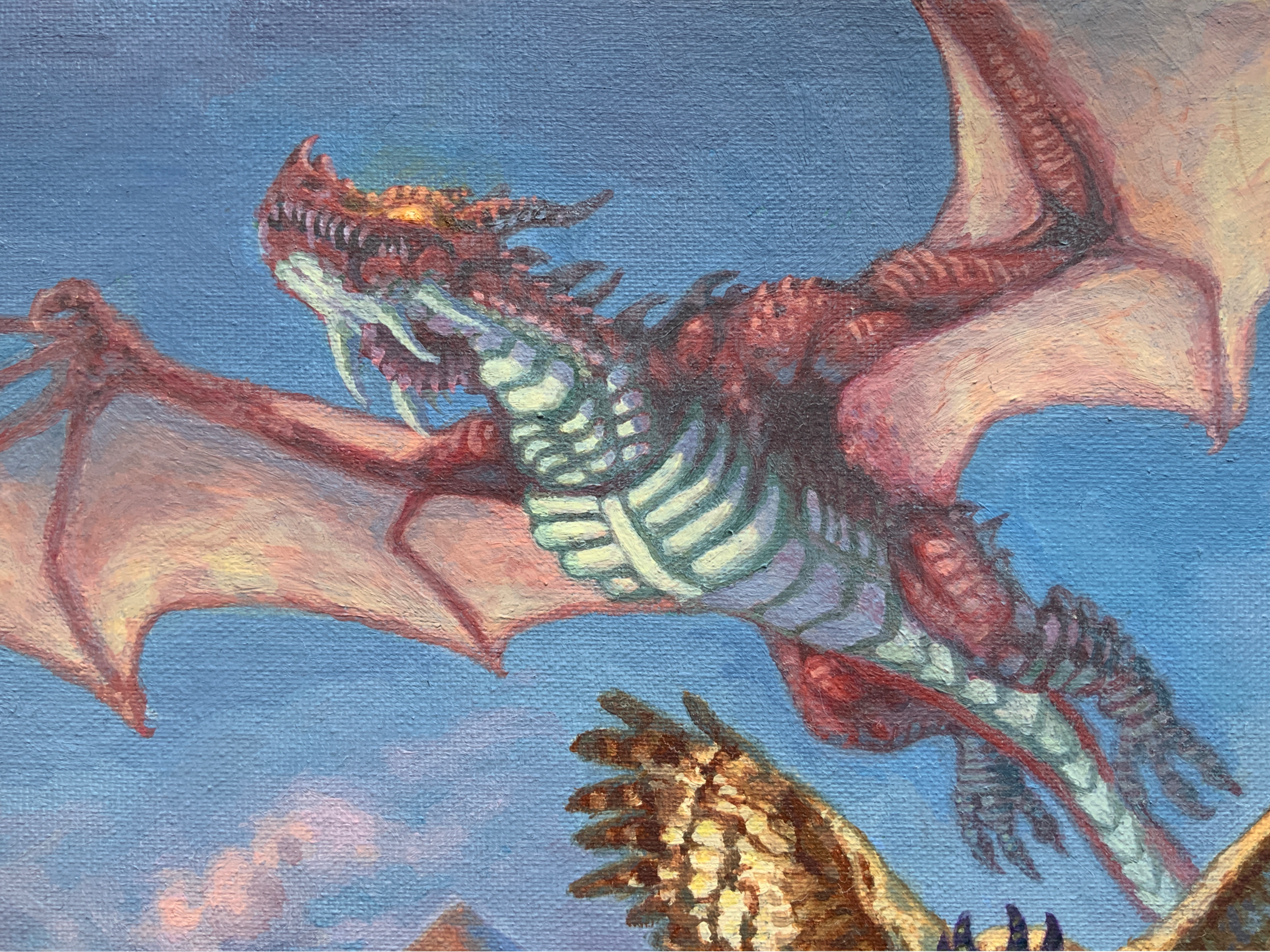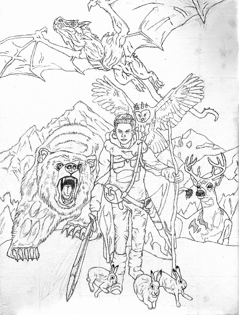 Self portrait of myself as an adventurer, warrior, and befriender of beasts. Focus on perspective, atmosphere, and the golden hour lighting to add interest and depth. Created my own maquette of a dragon and dressed up for reference.