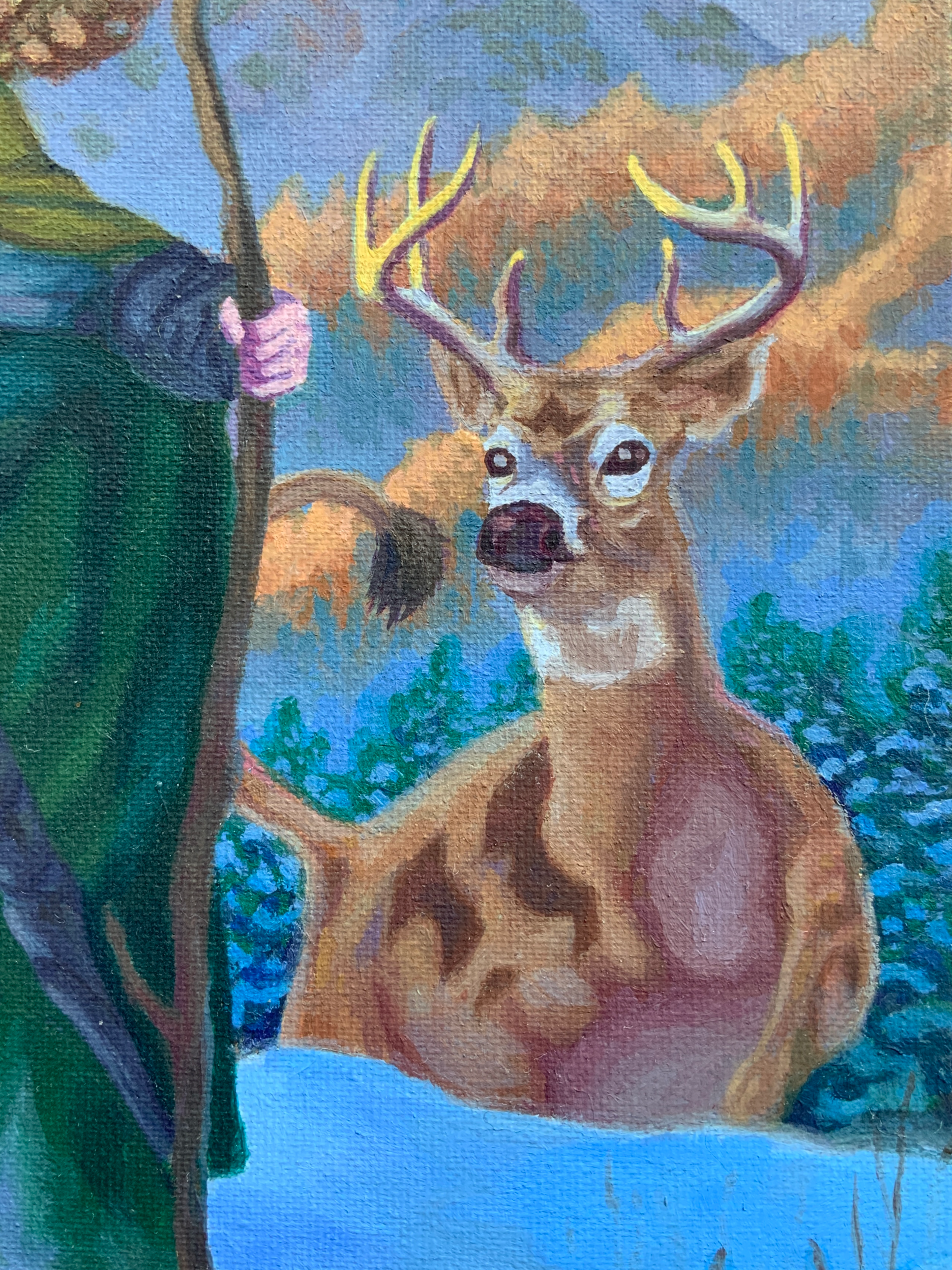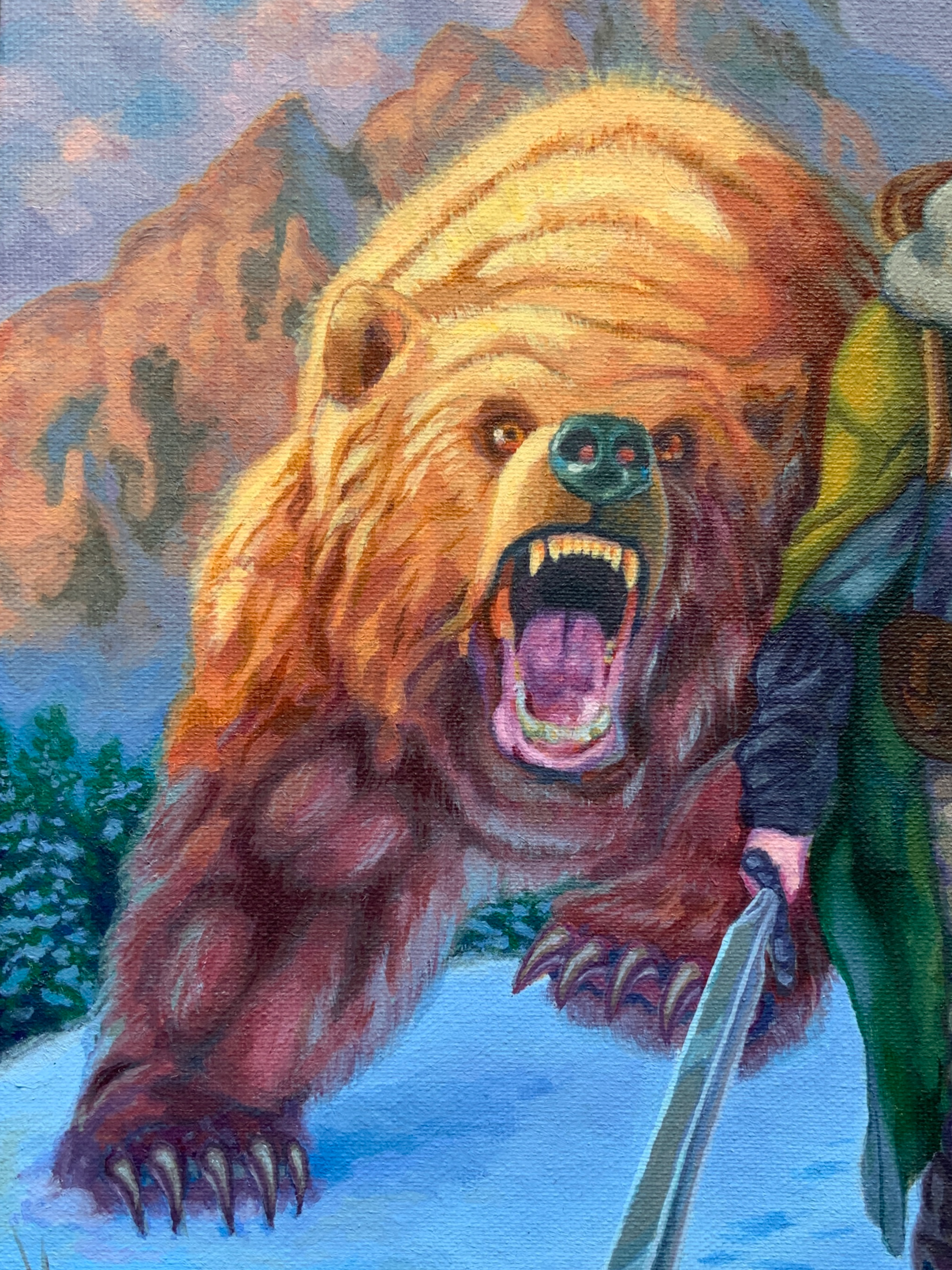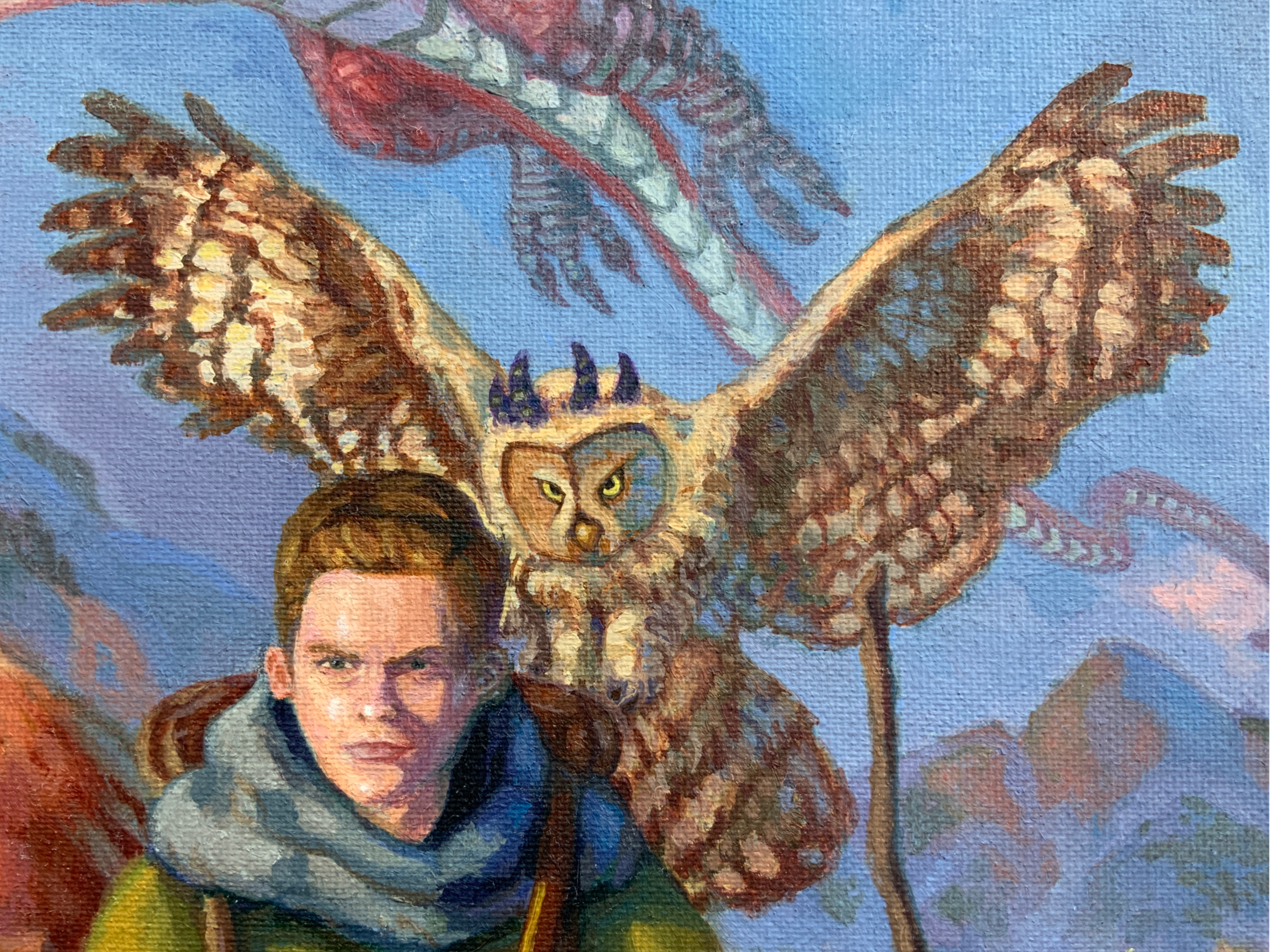 Self portrait of myself as an adventurer, warrior, and befriender of beasts. Focus on perspective, atmosphere, and the golden hour lighting to add interest and depth. Created my own maquette of a dragon and dressed up for reference.